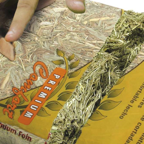Proporciona un cálido y confortable lecho fabricado en heno de alta calidad y 100% natural. Ocupa menos espacio con la misma capacidad y fácil de usar en porciones previamente cortadas.