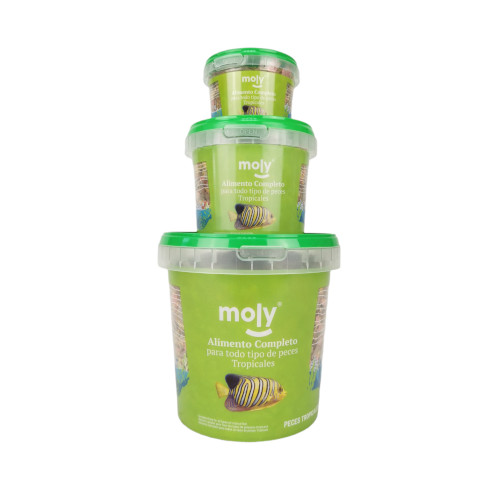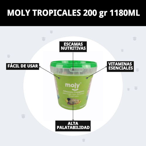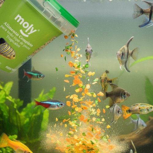 Moly Tropical es un alimento completo en escamas de 200 g, ideal para la alimentación diaria de tus peces omnívoros. Con una fórmula equilibrada que combina ingredientes vegetales y animales de alta calidad, garantiza un crecimiento y desarrollo saludable, además de cubrir todas sus necesidades energéticas y vitamínicas. ¡Cuida de tus peces como se merecen!