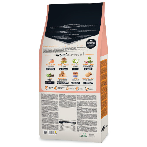 Salmón 30 % (salmón deshidratado 20 %, salmón fresco* 10 % mín. antes de la extrusión), guisantes enteros* (16 %), trigo integral* (15 %), maíz entero* (12 %), arroz integral* (8 %), grasa avícola (preservada con antioxidantes naturales), pulpa de remolacha, vaina de algarroba* (2 %), manzana* (1 %), semilla de lino* (1 %), aceite de salmón (preservado con antioxidantes naturales), levadura de cerveza* (0,5 %), fructo y manano oligosacáridos, plantas aromáticas 0,02 % (hinojo*, equinácea*, tomillo*), yucca shidigera. *Ingredientes naturales