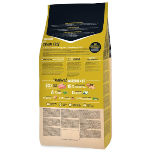 Pollo fresco* (mín. 20% antes de la extrusión), pollo deshidratado (16%), cerdo deshidratado (14%), guisantes enteros* (8%), patata deshidratada* (8%), grasa avícola (preservada con antioxidantes naturales), raíces de mandioca* (7%), salmón deshidratado (6%), proteína hidrolizada de pollo, levadura de cerveza* (1%), pulpa de remolacha, manzana* (1%), aceite de pescado (preservado con antioxidantes naturales), sal gema*, fructo y manano oligosacáridos, alfalfa deshidratada*, algas marinas deshidratadas* (500 mg/kg), glucosamina (500 mg/kg), yucca schidigera, condroitín sulfato (100 mg/kg), arándanos* (100 mg/kg), tomillo* (80 mg/kg), flor de manzanilla* (80 mg/kg), hinojo* (80 mg/kg), equinácea* (80 mg/kg), té verde* (80 mg/kg). *Ingredientes naturales