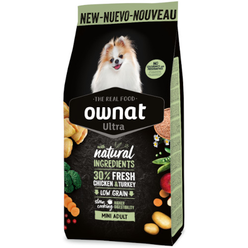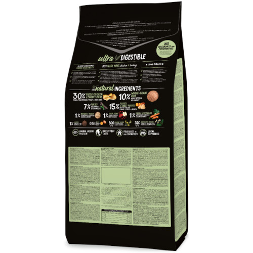 Pollo fresco* (15 % mín. antes de la cocción), pavo fresco* (15 % mín. antes de la cocción), pollo deshidratado (15 %), arroz integral* (10 %), grasa avícola (preservada con antioxidantes naturales), patata deshidratada* (8 %), batata deshidratada* (7 %), guisantes enteros* (4 %), cerdo deshidratado (3 %), vaina de algarroba* (3 %), verduras y frutas frescas antes de la cocción (manzana* 1 %, zanahoria* 0,5 %, brócoli* 0,5 %), salmón deshidratado, proteína hidrolizada de pollo, semilla de lino* (1 %), levadura de cerveza* (1 %), pulpa de remolacha, aceite de salmón (preservado con antioxidantes naturales), huevo deshidratado* (0,5 %), sal gema*, alfalfa deshidratada*, raíces de achicoria (FOS)*, extracto de levadura (MOS), algas marinas deshidratadas* (500 mg/kg), glucosamina (500 mg/kg), yucca shidigera, condroitín sulfato (100 mg/kg), arándanos* (100 mg/kg), té verde* (80 mg/kg), equinácea* (80 mg/kg), flor de manzanilla* (80 mg/kg), hinojo* (80 mg/kg). *Ingredientes naturales
